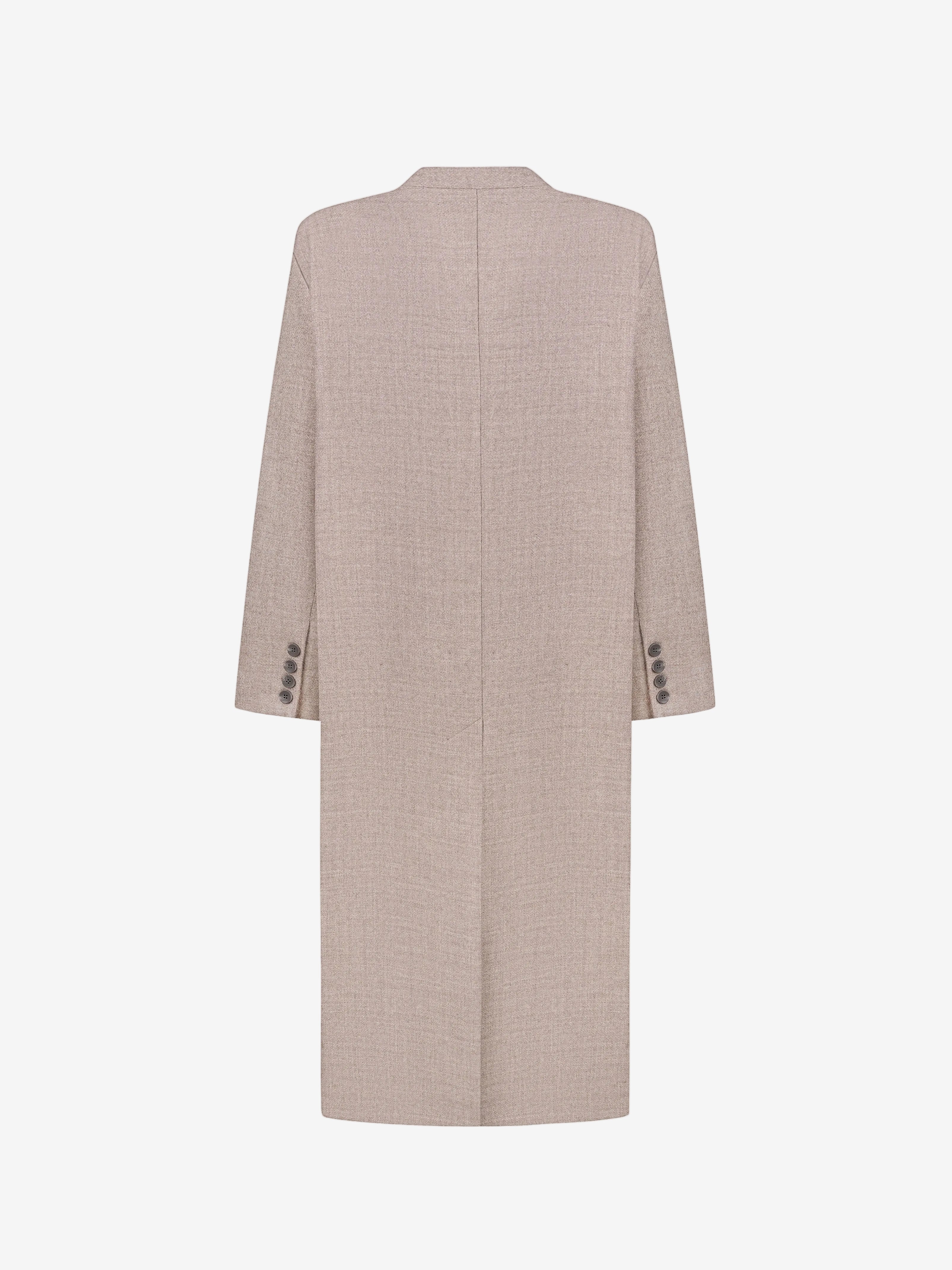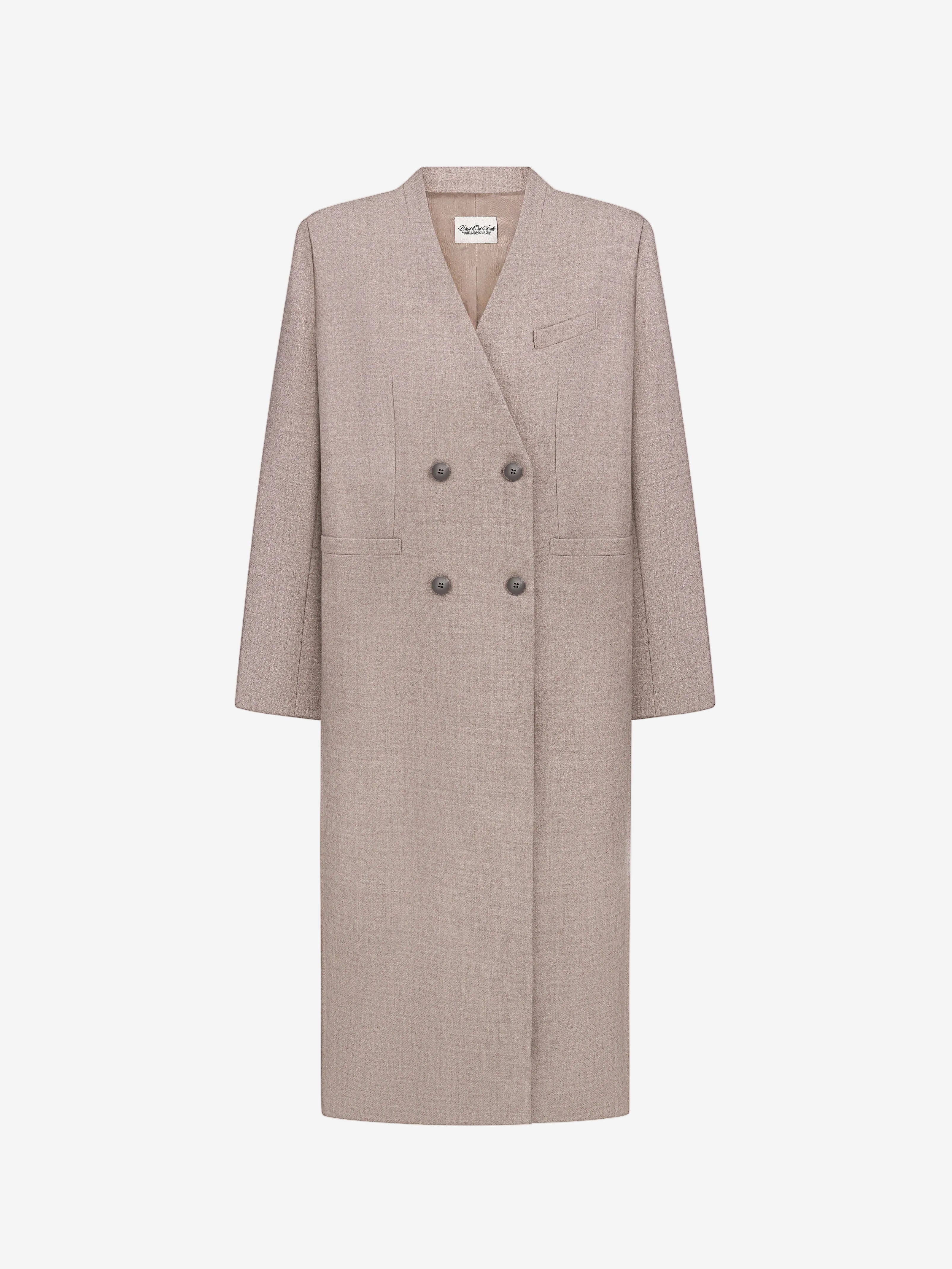 Бежеве довге пальто з чистої вовни з чітким, але м’яким силуетом. Мінімалістичний дизайн і нейтральний відтінок роблять модель універсальною базою для осінньо-зимового гардероба.